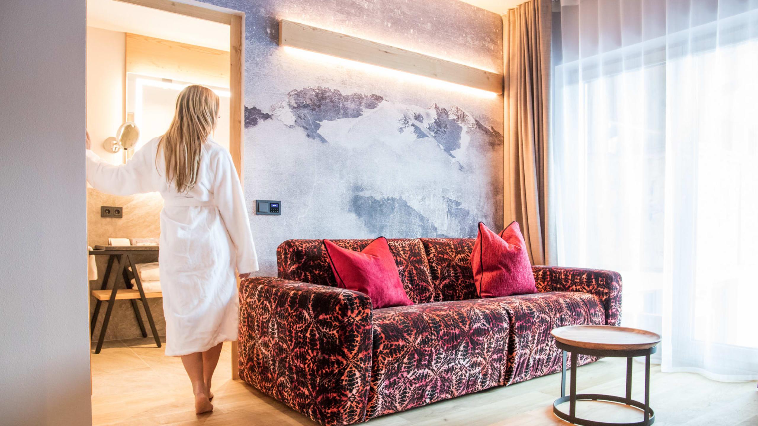 This exclusive suite with unique alpine design enjoys a privileged and very sunny location. Our Marmolada Suite has two bathrooms, one of which is characterized by a freestanding bathtub with a wonderful view over our mountains.